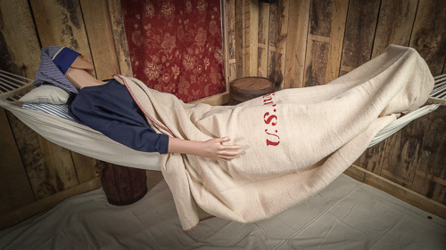 Our 1st rate mattress and pillows are made from 100% blue and white cotton ticking just as the originals were. Our standard length is 6 foot by a width of 2 foot with a 1 1/2 inch gussett all around. Then we over stuff it to measure about 3 inches thick. The pillow measures 12 by 10 inches and again about 3 inches thick. Rolls up easily and ties with string to make a small bundle for transport. I don't know how you could make a good nights sleep any easier than this.