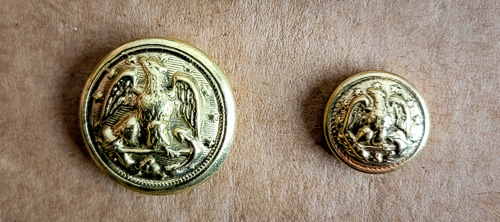 This 1819 model bayonet baldric buckle would have been seen on the US Regulars as well as many militia units up to and even after the US/Mex war. Remember, militias like the National Guard often get the "hand me downs" from the US Regulars and use them long after US reg's have changed. This buckle has a tin back with iron hooks.