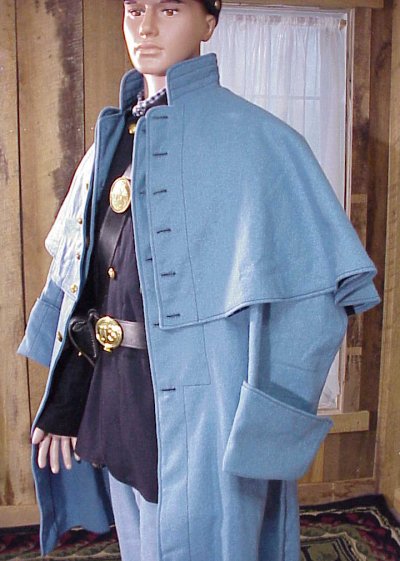 Infantry type great coat, made from the same great quality heavy 100% wool that we use in all our coats. Sky blue, Confederate or Richmond grey. Stand up collar, cape comes to just below the elbows. Overall length is to just below the knee on most people. Cuffs roll down to cover hands. It has an adjustable waist belt in the back. The cape is 6 button and the body is 5 button. Lined to the waist with muslin.
