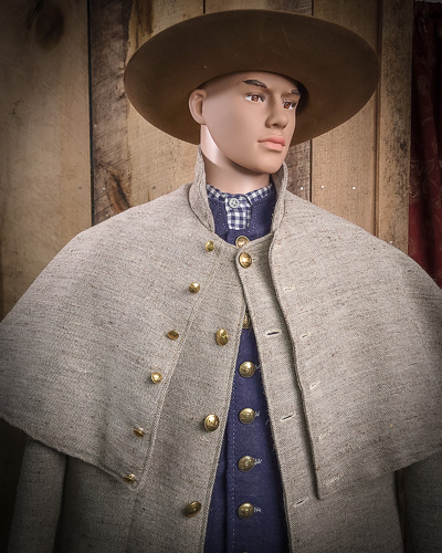 Confederate Gray Jean Wool Infantry great coat. Hand done button holes, one interior pocket over the left breast. Made from the same great quality heavy jean wool that we use in all of our jean wool coats and jackets. Stand up collar, the cape comes to just below the elbows. Overall length is to just below the knee on most people. No cuffs on this model. It has an adjustable waist belt in the back. The cape is 6 button and the body is 5 button, CSA buttons all sewn on. Completely lined with 100% cotton muslin.